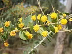 The shrub typically grows to a height of 2 metres (6.6 ft) with an open, sparsely branched habit and the branches tend to arch downwards. It has sparsely to moderately hairy branchlets than can be coated in a white powder. The dull-grey green phyllodes are widely spread and rotated to the branchlet. The phyllodes are often convex with a broadly elliptic to orbicular shape having a length of 10 to 25 m (33 to 82 ft) and a width of 9 to 20 mm (0.35 to 0.79 in).[2] The shrub flowers throughout the year.[3] The simple inflorescences have spherical flower-heads with a diameter of 9 to 11 mm (0.35 to 0.43 in) containing 25 to 75 densely packed deep yellow flowers. The straight to curved brown and firmly coriaceous seed pods that form after flowering have a broadly oblong shape and a length of 30 to 70 mm (1.2 to 2.8 in) and a width of 12 to 17 mm (0.47 to 0.67 in).[2]