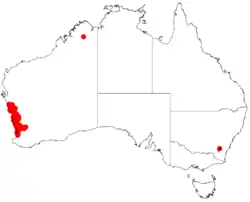 It is native to an area along the west coast in the Mid West, Wheatbelt and Peel regions of Western Australia where it is found growing in gravelly clay or lateritic sandy soils.[1] It is found from around Geraldton in the north west to around Yarloop in the south east.[4]