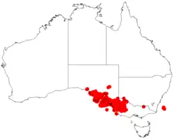 The species is found in a variety of soil types and ecological communities and associates with other plant species. In South Australia it is found in southern parts extending from the Great Victoria Desert in the west through to the border with Victoria in the east . It is also found on Kangaroo Island.[1] In Victoria the plant is only found in eastern areas in the mallee and goldfields regions extending north into south-western parts of New South Wales.[3]