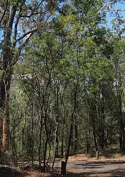 The shrub or tree typically grows to 6 metres (20 ft) in height. It has smooth grey-green bark, purplish-red branchlets and dark green subcoriaceous leaves along a 4 to 11 cm (1.6 to 4.3 in) long rachis containing 8 to 18 pairs of pinnae that are 2 to 6 cm (0.79 to 2.36 in) in length. Each pinnae is composed of 26 to 92 pairs of pinnules that have an oblong to cultrate shape with a length of 1.5 to 4 mm (0.059 to 0.157 in) and a width of 0.4 to 0.6 mm (0.016 to 0.024 in).[2] It blooms between April and August producing yellow flowers. The simple inflorescences are found in axillary racemes or in terminal false-panicles. The spherical flower-heads contain 14 to 20 cream to pale yellow coloured flowers. It forms seed pods between August and December. The coriaceous, dark red-brown or blue-black coloured pods are mostly straight-sided but can be slightly to deeply constricted between each of the seeds. The glabrous pods have a length of 2.5 to 11 cm (0.98 to 4.33 in) and a width of 8 to 12 mm (0.31 to 0.47 in) and are covered in a powdery white coating.[2] The seeds found within the pods are around 6 mm (0.24 in) in length and 3.5 mm (0.14 in) wide.[1] It is closely related to both Acacia filicifolia and Acacia olsenii.[2]