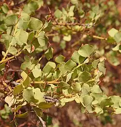 The erect, glabrous, spinescent and straggly shrub typically grows to a height of 1 to 3 metres (3 to 10 ft).[2] The yellowish-green to reddish-brown branchlets are slightly flattened and have smooth thin brown coloured bark.[3] The evergreen flat dull phyllodes have a rhomboid-orbicular shape and are up to 2 centimetres (0.8 in) in length and width and have one prominent major vein.[3] It blooms between June and October forming yellow flowers.[2] The simple axillary flower-spikes are usually solitary or occur in pairs and have large spherical deep golden-yellow flower-heads. Following flowering brown seed pods form that have an oblong shape and are around 8 cm (3 in) in length and 12 millimetres (0.472 in) wide. The pods are flat but raised over each seed.[3] The hard shiny black-brown[4] seeds have an ovoid shape and are about 5 mm (0.197 in) with a width of around 3.5 mm (0.138 in).[3]