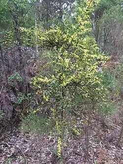 The erect slender and open shrub typically grows to a height of 1 to 3 metres (3 to 10 ft).[4] The prominently yellow-ribbed branchlets have pungent and hardened stipules with a length of 2 to 8 millimetres (0.079 to 0.315 in). The thin evergreen phyllodes have an obliquely lanceolate to ovate shape and are usually 5 to 11 centimetres (2.0 to 4.3 in) in length with a width of 1 to 4 cm (0.39 to 1.57 in). They are narrowed at base and have two to four prominent longitudinal nerves on the face.[1] It blooms from May to October and produces cream-yellow flowers.[4] The inflorescences occur as two to five headed racemes, usually with two on each node. The flower heads have a spherical shape and contain 8 to 12 loosely bunched pale yellow or white flowers. After flowering black sub-woody seed pods with a twisted narrowly linear shape that are around 14 cm (5.5 in) in length and 2 to 4 mm (0.079 to 0.157 in) wide. Each pod contains severalglossy dark brown seeds with an oblong to elliptic shape and a length of 3 to 4 mm (0.118 to 0.157 in).[1]