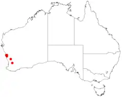 It is native to an area in the Mid West regions of Western Australia where it is commonly situated along the edges of seasonal lakes growing in sandy to sandy-clay soils.[2] It has a limited range near Eneabba especially around Lake Eneabba and is usually a part of low woodland or low open forest communities.[1]