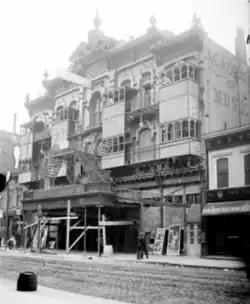 The third Academy of Music, also known as Shelby's Academy, was located at 16 S. Halsted St.[5] It opened in 1882,[5] and was originally operated as legitimate theatre under the ownership of W. B. Clapp. The theatre was sold to C. E. Pope in 1887.[15] It was converted into a movie theatre for silent films in 1915. It continued to operate as a movie theatre until 1934 when it permanently closed. The building was demolished in 1936.[5]