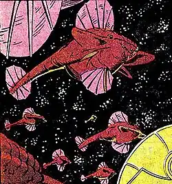 The Acanti are colossal whale-like creatures with several pairs of fins and widely spaced eyes. An adult Acanti can grow to several miles in length, and even an infant is large enough to swallow a spaceship.[1] They communicate through psionic sounds referred to as songs and can fly faster than the speed of light without assistance.[2][3][4]