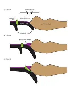 Accretion involves the addition of material to a tectonic plate via subduction, the process by which one plate is forced under the other when two plates collide.[3] The plate which is being forced down, the subducted plate, is pushed against the upper, over-riding plate. Sediment on the ocean floor of the subducting plate is often scraped off as the plate descends. This accumulated material is called an accretionary wedge (or accretionary prism), which is pushed against and attaches to the upper plate.[3] In addition to accumulated ocean sediments, volcanic island arcs or seamounts present on the subducting plate may be amalgamated onto existing continental crust on the upper plate, increasing the continental landmass.[3]