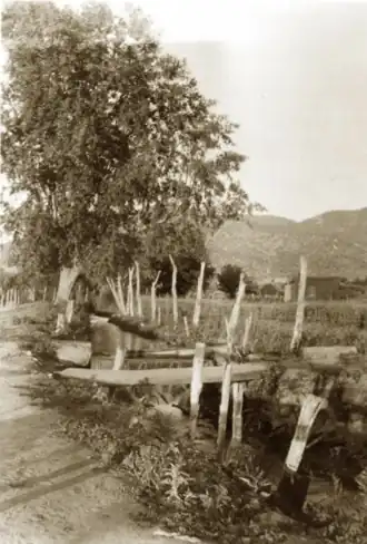 The Acequia Madre continues to flow annually through a ditch that is partially stone lined, and approximately one to two feet deep. Its width ranges from approximately two feet to five feet wide. Mature cottonwood trees grow along the ditch, mainly between the ditch and the adobe walls and coyote fences of various properties. Several historical houses are adjacent to the ditch, some of those along the south side still use acequia water to irrigate orchards, alfalfa and other grain fields, vegetable gardens. These plantings were watered by smaller ditches perpendicular to the Mother Ditch. It was a Spanish custom to deed land in parcels in long and narrow strips to such that each property had equal access to the acequia water. There was a historical mill at the intersection of Acequia Madre Road and Abeyta Street, where the Acequia del Ranchos (shown on the King Map) intersected with the Acequia Madre.[10]