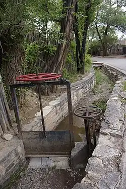 The acequia continues to this day to be governed by the early Spanish laws. The ditch has a board of three commissioners charged with insuring it is kept in good-working order and a Spanish: mayordomo de la acequia. The acequia is still used by some residents to irrigate grazing land and fruit trees; property owners with water rights leases along the ditch pay an annual fee, and are responsible for keeping the acequia cleared of debris each spring; the ditch cleanup is known as the Spanish: limpieza y saca de acequia. The ditch-association members are traditionally known as Spanish: parciantes, indicating their stake or portion of the acequia association's labor resources. Sometimes in English the members are called 'irrigationists'.[8] While the flow in the ditch is regulated, water has "never ceased to flow" each year.[1][4][9]