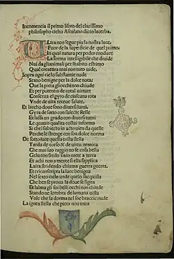 It is unfinished, and consists of 4,865 verses in sesta rima in four volumes. The first volume treats of astronomy and meteorology; the second of stellar influences, of physiognomy, and of the vices and virtues; the third of minerals and of the love of animals; while the fourth propounds and solves a number of moral and physical problems. The fifth volume was on theology, but only its first chapter was completed.