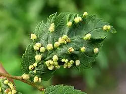 There is some disagreement as to which species is involved in forming the galls. Mite pimples on elms with small leaves, vary in size and some of the large galls have stalked dimples The small galls have been described as Aceria ulmicola (Napela) and the stalked galls as Aceria brevipunctata.[3][4]