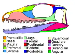 The mandible (lower jaw) was long and slender. The rear part of the mandible, which was formed by the articular bone, bears a facet which connects to the quadrate bone of the cranium to form the jaw joint. Both the quadrate and the corresponding facet on the mandible are very large and strongly built.[2]