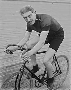 During the winter of 1905–1906, Germain trained alongside the best specialists of the day on the Vélodrome d'Hiver track in Paris. Though he could see the gap existing between him and those in the lead, Germain's persistence in training was noticed. Along with Georges Parent, he was chosen to join the coaching team of Henri Cornet, winner of the 1904 Tour de France, in a 50-kilometer tandem match[notes 1] against Karl Ingold. Cornet won by nine laps. At the same meeting, Germain made his mark as an individual in the 15-kilometer race behind motorcycles. Third behind Paul Rugère and Anton Jaeck, his offensive behavior throughout the race was praised by the spectators.[7] On February 18, he teamed up with Denmark's Axel Hansen in the American-style Twelve Hours race, in which the two competitors took turns at will. At the end of the race, fourteen teams were still classified in the same lap: victory was therefore decided over six laps between the best sprinters in each team. Hansen initially placed fourth, but the commissaries were slow to validate the results after a crash on the last lap. The race was eventually canceled.[7] On March 4, a meeting was held at the La Flèche Velodrome, bringing together several well-known riders. On his home turf, Germain took third place in the bonus race behind Charles Vanoni and Victor Thuau, before losing out to César Simar, Olympic medalist two years earlier, in the 10-kilometer race behind the bike.[8]