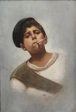 Among his works are: Tell Me Yes (a large canvas with figures painted from life, exhibited in Rome); Everything for the Children (a Neapolitan genre scene, exhibited at the "Society for the Promotion of the Fine Arts" of Naples); The Resting Workers; and The Odalisques (an Orientalist scene).[3] He would become a regular exhibitor at the Society, from 1879 to 1896. The Province of Naples purchased his work The Wandering Jew in 1881.[2]