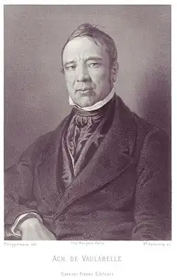 Achille Tenaille de Vaulabelle was born in Châtel-Censoir, Yonne, on 28 October 1799. He joined the administration under the Bourbon Restoration as an attaché to the cabinet of the office of the Prefect of the Yonne. He then went to Paris and became a journalist. In 1824 he published Le Nain jaune (Yellow Dwarf) and founded the liberal newspaper Pour et le Contre (Pro and Con). After the July Revolution this became the Révolution de 1830. He was chief editor of the Messager. He worked at the National in 1838. He published the Modern history of Egypt (1835) and History of the Restorations (1844).[2]