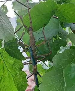Achrioptera manga is a species of phasmid or stick insect of the genus Achrioptera, found in Madagascar and the Comoros Archipelago. Stick insects usually blend into their background, but the male A. manga is blue, standing out against the surrounding foliage.[1] It is one of the largest insects, able to reach lengths of 24 centimetres (9.4 in).[2]