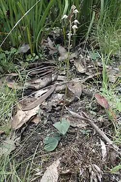 Acianthus cuneatus, commonly known as New England mosquito orchid,[2] is a species of flowering plant in the orchid family Orchidaceae and is endemic to the Northern Tablelands of New South Wales. It is a terrestrial herb with a single, heart-shaped leaf and up to seven translucent greenish flowers with purplish stripes and is found growing in sheltered slopes in open forest.
