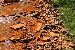 Rocks stained by ferrous precipitate from acid mine drainage on Shamokin Creek in Northumberland County, Pennsylvania