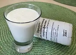 Acidophiline (Russian: ацидофилин) is a type of drinkable yogurt, with Lactobacillus acidophilus as the starter culture. Kefir yeast is also added sometimes.[1] It has antibacterial properties and is used in the former Soviet Bloc countries to treat intestinal diseases such as colitis and enterocolitis.[2] The sweetened acidophiline was widely produced in the USSR, among other fermented milk drinks, such as kefir and ryazhenka.