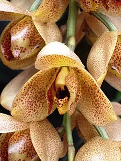 The large, plicate leaves are parallel-nerved and resemble those of Peristeria and Lycaste, while the structure of the flowers bears a closer resemblance to Stanhopea.