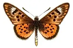 A. doubledayi Guer. (= gaekwari E. Sharpe) (55 e) may be easily known by the shape of the marginal band of the hindwing, the red-brown ground-colour of the upper surface and the strongly developed black markings, as well as by the small light or transparent spots in 4 to 6 of the fore wing behind the discal dots; under surface of the hindwing reddish yellow with large whitish marginal spots. In the type-form the forewing above has a broad black marginal band, which is formed by the union of the black submarginal streaks with the veins and the marginal line, reaches the light subapical band and encloses yellow marginal spots; both wings above darkened at the base. Abyssinia and Somaliland. - female ab. candida Eltr. [ female f. of Acraea sykesi] differs in the white ground-colour of both wings. Niam-Niam. - arabica Eltr. has the wings more densely scaled with whitish, but not transparent, subapical band on the forewing; the wings above not or scarcely darkened at the base. Arabia. sykesi E. Sharpe has the ground-colour on the upper surface lighter, on the forewing only separated by a black line from the distal margin; the broad black marginal band is consequently entirely absent and the black submarginal streaks in cellules 2 to 5 are placed free in the ground-colour; the light subapical band of the forewing is indistinct or entirely absent. German and British East Africa; Uganda and Soudan.[4]