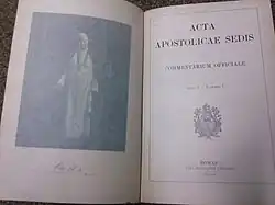 Acta Apostolicae Sedis (Latin for 'Acts of the Apostolic See'), often cited as AAS, is the official gazette of the Holy See,[1] appearing about twelve times a year.[2] It was established by Pope Pius X on 29 September 1908 with the decree Promulgandi Pontificias Constitutiones, and publication began in January 1909.[2] It contains all the principal decrees, encyclical letters, decisions of Roman congregations, and notices of ecclesiastical appointments.[3] The laws contained in it are to be considered promulgated when published, and effective three months from date of issue, unless a shorter or longer time is specified in the law.[3][4][5]