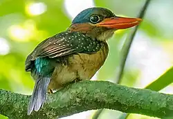 The genus Actenoides was introduced by the French ornithologist Charles Lucien Bonaparte in 1850. The type species is Hombron's kingfisher (Actenoides hombroni).[2] The name of the genus is from the Ancient Greek aktis, aktinos for "beam" or "brightness" and -oidēs for "resembling".[3] A molecular study published in 2017 found that the genus Actenoides, as currently defined, is paraphyletic. The glittering kingfisher in the monotypic genus Caridonax is a member of the clade containing the species in the genus Actenoides.[1]