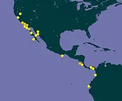 This marine species occurs in the Pacific Ocean from Santa Barbara, California to Colombia and Peru.; depths: 3–100 m, rarely to 305 m.