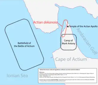 The Actian dekanaia (Ancient Greek: δεκαναΐα, literally 'set of ten'[1]) was a Roman trophion at the Cape of Actium composed of a dedication of ten warships, which served as a memorial for Caesar Augustus' naval victory over the allies of Mark Antony and Cleopatra VII in the Battle of Actium. Since no conclusive archaeological remains have been identified so far, the descriptions of the site by classical authors, especially Strabo, remain the only sources available.[2]