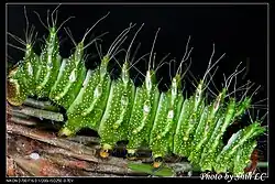 The female lays up to 120 eggs, and may place their eggs anywhere. The egg is oval-shaped, 1.5 by 1 millimetre (0.059 in × 0.039 in); whitish gray, and firmly stuck to branches or sides of the cage that the female had been kept in. Caterpillars, 4–5 millimetres (0.16–0.20 in) long, hatch after 10–14 days, the warmer and the higher the humidity, the quicker it happens.