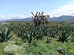 Actopan is located in the Sierra Madre Oriental and southern Serranías floristic provinces within the Mesoamerican Mountain region.[152] Most of its vegetation is made up of unarmed and thorny scrublands, grasslands, maguey, nances, opuntia stricta, mesquites, acacias, bilberry cacti, pitayas, chollas, alicoches and echinocactus.[1][2] The fauna in this region includes rabbits, squirrels, opossums, scorpions, lizards, spiders, centipedes, crickets, grasshoppers, ants and pinacate beetles.[1][2]