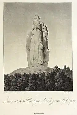 On May 15, 1803, Alexander von Humboldt arrives in Pachuca, visits the mines in the area and on May 21 leaves for Atotonilco El Grande.[69] On May 22 he spent the night in the town of Baños de Atotonilco near the Villa de Magdalena and the Puente de Dios.[69] During May 23 and 24 he would travel through the Actopan Valley, and then leave on May 25 for Mexico City.[69] During the visit, Humboldt drew and studied the Organs of Actopan, also known as Los Frailes,[70][71] located 17 km southeast of Actopan in the municipality of El Arenal.[2] Humboldt determined their height trigonometrically.[72]