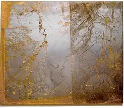Alexia Nikov, of Russia, whose metallic paintings change over time from the effects of patinas & the environment;[16]"Desna" by Alexia Nikov, metal powders, rain & patinas on canvas, 60" x 72"