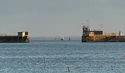 Beginning in 1958, the New Bedford Harbor Hurricane Barrier was built from a point about 300 feet north of Fort Phoenix, in Fairhaven, to Gifford Street on the New Bedford coast. The 20-foot high barrier continues onto land, where three large doors allow street traffic to pass through during calm seas.[2] The longer segment continues along the New Bedford coast to just before Frederick Street. A discontiguous segment protects the top of Clark's Cove in New Bedford, roughly to the Dartmouth border.