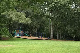 There are three parks in Adair Park. The first recreational park in the district was established in 1922. Adair Park I comprises 20 lots originally designated for houses that were not sold due to the sloped topography and swampy ground. Landscaped with open areas, mature trees, brick walkways, and a playground, the park has on its grounds a one-story brick bathhouse built in 1930. This park is generally used for neighborhood gatherings, informal pick-up games, and walking. The second park in the district was established in the 1980s on a large parcel of land that was once a lumberyard. Adair Park II features a recreational baseball field, a covered basketball court, tennis courts, and a playground. The third park is Bonnie Brae Park, a .19-acre garden park.[7]