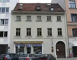 Due to the damages during the Second World War[1] and other changes, the Adalbertstraße shows a heterogeneous development. From the original two-storey buildings, only the house no. 14 from the period around 1827/30 has been preserved. The original buildings were replaced, starting in the 1860s, by mostly four-storey rental buildings and commercial buildings in the style of the Neo-Renaissance.