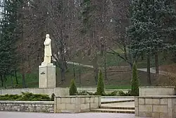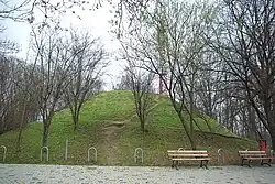 The park's establishment was spearheaded by August Ścibor-Rylski, who personally planted the first trees.[5] On 25 August 1900, he guided Leon Piniński, the Galician Governor, through the park.[6] In 1898, the Sanok City Council named the park and the adjacent eastern street after Adam Mickiewicz to mark the centenary of his birth.[7][8] That same year, a small Adam Mickiewicz Mound was created by local high school students on the hill's summit, later expanded significantly. In 1905, a committee purchased adjacent land from Ms. Tebinkowa to enlarge the mound.[9] Work continued from 27 September 1905, with voluntary participation from residents and students,[10] until 1910.[11][12] A commemorative stone was placed to honour Mickiewicz's centenary. The park was developed on the hill's slopes.[13]