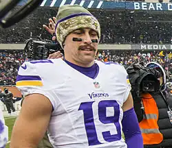 Thielen made his NFL debut in the season opener in a road game against the St. Louis Rams on September 7.[16] In Week 5, he caught his first NFL pass in the Vikings' 42–10 road loss against the Green Bay Packers, finishing the game with four receptions for 57 yards that led the team in receiving.[17] He was named NFC Special Teams Player of Week 13 after he scored his first NFL touchdown on a special teams play in which he blocked Carolina Panthers' punter Brad Nortman's kick and returned the ball 30 yards to the end zone.[18] Thielen briefly held the record for the longest blocked punt returned for a touchdown in franchise history, but was beaten later in the second quarter with a 43-yarder from Everson Griffen as the Vikings had two blocked punts returned for touchdowns in the game.[19] In Week 17 against the Chicago Bears, Thielen scored his first receiving touchdown on a 44-yard pass from quarterback Teddy Bridgewater, after which he promptly gave the ball to his wife (then fiancée) Caitlin.[20][21]