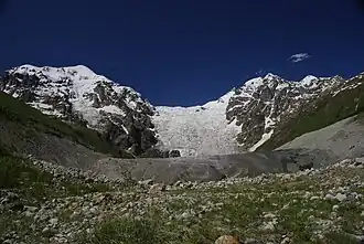 Adishi Glacier (Georgian: ადიშის მყინვარი) is a valley glacier located in the central part of the Greater Caucasus Mountain Range in the Svaneti Region of Georgia. The glacier lies on the southern slopes of the Caucasus. The length of the Adishi Glacier is 9 km (5.6 mi) and its surface area is 12.9 km2 (5.0 sq mi). The tongue of the glacier descends down to 2,298 m (7,539 ft) above sea level. The glacier feeds off of the runoff and ice flows from the adjacent glaciers that are located on the southern slopes of Tetnuldi, Gistola and Lakutsia. The Adishi Glacier is the source of the river Adishchala. The glacier takes its name from the nearby village Adishi.