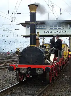 To celebrate the centenary of the railways in Germany in 1935, a replica of the Adler was built beginning from 1933 by the Deutsche Reichsbahn in the Kaiserslautern repair shop (Ausbesserungswerk), which was largely true to the original. The original idea of the President of the Reichsbahn Julius Dorpmüller and the members of his staff was to use the Adler-replica as an instrument of propaganda for the "new era" in the city of the Reichsparteitag Nuremberg. They planned to contrast the Adler with modern gigantic steam locomotives like the high-speed DRG Class 05. For the realisation of the replica they used the results of the planning in 1925. Besides of different technical data the replica differed from the original with thicker boiler casing and additional cross bracings and spokes wheels made of steel.[12] The replica attained an average speed of 33.7 km/h in tests on an 81 kilometre stretch of line. The route had gradients of between 1:110 and 1:140. From 14 July until 13 October 1935, visitors could travel with the reconstructed Adler-train on a track length of two kilometres on the area of the centenary exhibition in Nuremberg. On the driving cab were also the President of the Deutsche Reichsbahn Julius Dorpmüller and the Gauleiter of Franconia Julius Streicher. The Adler-replica was in use after that in 1936 at the Cannstatter Wasen in Stuttgart and during the 1936 Summer Olympics in Berlin. During the 100-years-jubilee of the first Prussian railway in 1938 the Adler-train was in service between Berlin and Potsdam. After this event the Adler-train was sent to the Nuremberg Transport Museum.