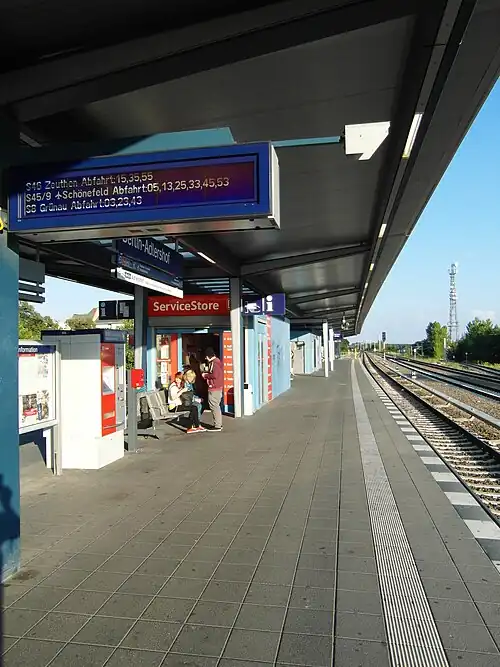 The new platform area was opened on 15 July 2009. The southern access tunnel was extended to Adlergestell and the new exit opened on 11 November 2010.[5] The construction work on the underpass should originally have been completed by the end of 2010, but was delayed until 30 November 2011. On that day, Rudower Chaussee was reopened for general through traffic.