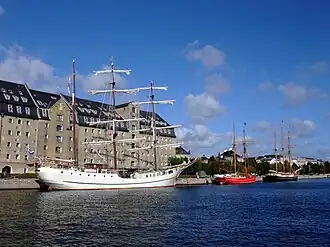 The building was originally two separate warehouses which were commissioned in 1781 for the newly chartered trading company, Østersøisk-Guineiske Handelskompagni which was established in 1781 and superseded by Pingel, Meyer, Prætorius & Co. The buildings were completed in 1787 to designs by engineering officer Ernst Peymann. They were taken over by the Crown in 1788 and then came into use as granaries. The two buildings were connected in 1885, creating the long building seen today.[1] The building stored up to 30,000 barrels of grain.[2]