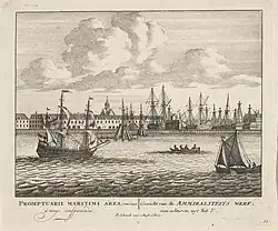 Like petty officers and sailors in general, commissioned sea officers were also dependent on their posting, since they received no payment from the admiralty whilst in port. Indeed, even though for officers "meals at the captain's table were ... always free", pay was only thirty guilders for a lieutenant and sixty guilders for a commandeur (i.e. acting captain) commissioned on a ship.[9] It has been rightly observed that their main income was from captured ships.[10] In 1652, after the outbreak of the First Anglo-Dutch War, the Admiralty of Rotterdam hired ships in Amsterdam.