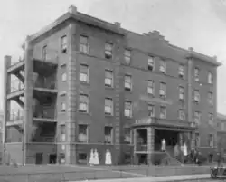 Advocate Illinois Masonic Medical Center was founded in 1901 by the Belden Avenue Baptist Church (founded 1897)[8] Steadfast Sunday School class (2309 N. Halsted Street) as the Chicago Union Hospital.[9][10][11] Originally a two-and-one-half story frame building which was rented for $50 a month, it contained 30 beds, 10 used by nurses, house physicians and staff, and 20 by patients, 5 of whom could afford to pay for their hospitalization.[12][13] On March 3, 1905, the main building was destroyed by fire when a blaze broke out in the laboratory. In 1909 a new hospital building opened, which was equipped with an x-ray machine.[10] In 1910, Martha A. Pippereit was superintendent.[11]