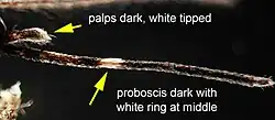 The main physical distinctions between Ae. taeniorhynchus and other species come from the white banding that covers several body parts along Ae. taeniorhynchus. The species, like other Aedes mosquitoes, exhibits basal banding of the abdomen, but Ae. taeniorhynchus also uniquely exhibits white-tipped palps and a central white ring on the proboscis.[13]