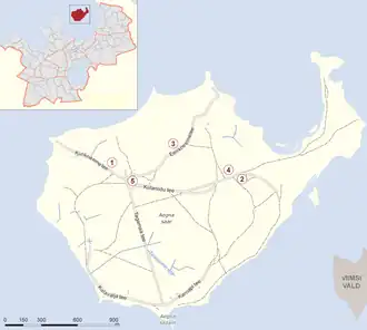 Aegna island has an area of 3 km2, and can be found off the Viimsi peninsula, around 1.5 km NW of Rohuneeme and 14 km north of Tallinn. It has a 10 km coastline which includes two sandy beaches. The island's highest point is about 13 m above sea level.