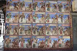 Prayers mentioning the aerial accusers can be found in Liturgical texts and official E. Orthodox books like the Slavonic Great Euchologion (The Great Book of Needs): "do thou banish from me the commander of the bitter toll-gatherers and ruler of the earth [...] O holy Theotokos" (Ode 8, Troparion 3).[7] Other church hymns say that the souls have to "pass through the rulers of darkness standing in the air."[8][9] In the Greek and Slavonic Euchologion, in the canon for the departure of the soul by St. Andrew, the following words are found in Ode 7: "All holy angels of the Almighty God, have mercy upon me and save me from all the evil toll-houses". In the Canon of Supplication at the Parting of the Soul in The Great Book of Needs are found the following references to the struggle of a soul passing through the toll houses: "Count me worthy to pass, unhindered, by the persecutor, the prince of the air, the tyrant, him that stands guard in the dread pathways, and the false accusation of these, as I depart from earth" (Ode 4, p. 77). "Do thou count me worthy to escape the hordes of bodiless barbarians, and rise through the aerial depths and enter into Heaven" (Ode 8, p. 81).