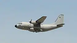 The G.222 is a twin turboprop-engine tactical military transport aircraft, and is designed to be capable of transporting equipment or troops in combat zones and operating with minimal ground support.[12] Early production aircraft were exclusively fitted with the General Electric T64-GE-P4D turboprop engine, the licence-built Rolls-Royce Tyne was made available as an alternative powerplant for the type from 1980 onwards, while the Allison T56 was another proposed powerplant for the type.[7][9] Due to features such as double-slotted flaps, stacked brakes, and reversible propellers,[19] the G.222 has excellent short landing capabilities and is able to land in as little as 1,800 feet.[20] It was designed to be integrated with the larger, commonplace Lockheed C-130 Hercules.[5]