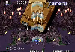 The game also contains a number of secrets; both of the last bosses will very rarely be replaced by hidden bosses, who also grant hidden endings. Some smaller enemies will sometimes exhibit unusual behaviour; for example, the gun turrets in the USA stage will occasionally turn into a bust of Villiam from Aero Fighters.