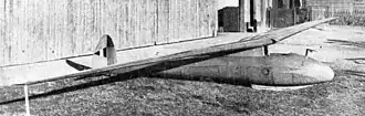 The competition stipulated the 15 m (49 ft 3 in) span gliders had to be wooden, though fabric covering could be used.[1] Its cantilever wing was built around a single spar[2] with plywood skinning around the wing forward of it. The wing was attached to a pylon about 230 mm (9 in) above the fuselage and at the centreline the wing ply extended back to about 70% chord, returning to the spar about 1 m (3 ft 3 in) along it. The wing planform was strongly double straight tapered, mostly on the trailing edge where ailerons occupied almost half the span.[1] These were split into two nearly equal sections and acted differentially. Parallel ruler type airbrakes were placed a little inboard of the ailerons, at mid-chord.[2] Near the roots the airfoil section was NACA 4514; further out this was tapered into the symmetric NACA 0012 of the tips, which had 4° of washout to prevent tip stalling.[1]