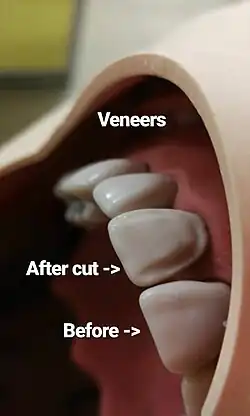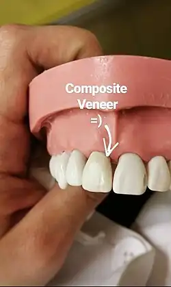 - ^ a b Korkut, Bora (2018). "Smile makeover with direct composite veneers: A two-year follow-up report". Journal of Dental Research, Dental Clinics, Dental Prospects. 12 (2): 146–151. doi:10.15171/joddd.2018.023. ISSN 2008-210X. PMC 6076883. PMID 30087767.
